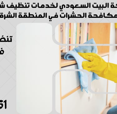 "نحن في شركة البيت السعودي نقدم خدمات تنظيف شاملة ومتكاملة تشمل تنظيف الشقق، المنازل، الفلل، القصور، والمكاتب، بالإضافة إلى مكافحة الحشرات بأنواعها وعزل الخزانات والأسطح. نغطي جميع مدن المنطقة الشرقية مثل الدمام، الخبر، القطيف، الجبيل، رأس تنورة، النعيرية، بقيق، الأحساء (الهفوف والمبرز)، والظهران. تواصل معنا الآن لخدمة احترافية بأعلى معايير الجودة."