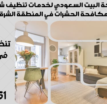 "نحن في شركة البيت السعودي نقدم خدمات تنظيف شاملة ومتكاملة تشمل تنظيف الشقق، المنازل، الفلل، القصور، والمكاتب، بالإضافة إلى مكافحة الحشرات بأنواعها وعزل الخزانات والأسطح. نغطي جميع مدن المنطقة الشرقية مثل الدمام، الخبر، القطيف، الجبيل، رأس تنورة، النعيرية، بقيق، الأحساء (الهفوف والمبرز)، والظهران. تواصل معنا الآن لخدمة احترافية بأعلى معايير الجودة."