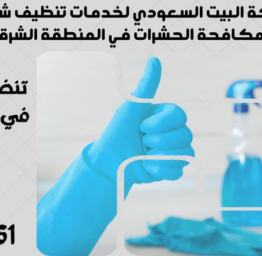 "نحن في شركة البيت السعودي نقدم خدمات تنظيف شاملة ومتكاملة تشمل تنظيف الشقق، المنازل، الفلل، القصور، والمكاتب، بالإضافة إلى مكافحة الحشرات بأنواعها وعزل الخزانات والأسطح. نغطي جميع مدن المنطقة الشرقية مثل الدمام، الخبر، القطيف، الجبيل، رأس تنورة، النعيرية، بقيق، الأحساء (الهفوف والمبرز)، والظهران. تواصل معنا الآن لخدمة احترافية بأعلى معايير الجودة."