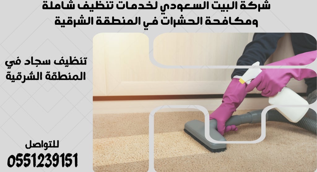 إذا كنت تبحث عن خدمة تنظيف سجاد متميزة في المنطقة الشرقية، فلا تتردد في الاتصال بشركة البيت السعودي. نحن نقدم مجموعة من الخدمات المتخصصة لتلبية احتياجاتك في تنظيف السجاد، حيث يستخدم فريقنا المحترف أحدث المعدات والمنتجات المبتكرة لضمان الحصول على أفضل النتائج. سواء كان لديك سجاد عادي أو منسوجات ثمينة، نحن ملتزمون بتقديم خدمة عالية الجودة تعيد لجمال سجادك بريقه. يمكنك التواصل معنا عبر الرقم 0551239151 للحصول على استشارة مجانية أو لتحديد موعد. دعنا نساعدك في الحفاظ على سجادك نظيفًا ومشرقًا لأطول فترة ممكنة!