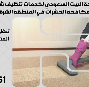 "نحن في شركة البيت السعودي نقدم خدمات تنظيف شاملة ومتكاملة تشمل تنظيف الشقق، المنازل، الفلل، القصور، والمكاتب، بالإضافة إلى مكافحة الحشرات بأنواعها وعزل الخزانات والأسطح. نغطي جميع مدن المنطقة الشرقية مثل الدمام، الخبر، القطيف، الجبيل، رأس تنورة، النعيرية، بقيق، الأحساء (الهفوف والمبرز)، والظهران. تواصل معنا الآن لخدمة احترافية بأعلى معايير الجودة."