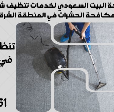 "نحن في شركة البيت السعودي نقدم خدمات تنظيف شاملة ومتكاملة تشمل تنظيف الشقق، المنازل، الفلل، القصور، والمكاتب، بالإضافة إلى مكافحة الحشرات بأنواعها وعزل الخزانات والأسطح. نغطي جميع مدن المنطقة الشرقية مثل الدمام، الخبر، القطيف، الجبيل، رأس تنورة، النعيرية، بقيق، الأحساء (الهفوف والمبرز)، والظهران. تواصل معنا الآن لخدمة احترافية بأعلى معايير الجودة."