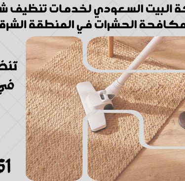 "نحن في شركة البيت السعودي نقدم خدمات تنظيف شاملة ومتكاملة تشمل تنظيف الشقق، المنازل، الفلل، القصور، والمكاتب، بالإضافة إلى مكافحة الحشرات بأنواعها وعزل الخزانات والأسطح. نغطي جميع مدن المنطقة الشرقية مثل الدمام، الخبر، القطيف، الجبيل، رأس تنورة، النعيرية، بقيق، الأحساء (الهفوف والمبرز)، والظهران. تواصل معنا الآن لخدمة احترافية بأعلى معايير الجودة."