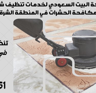"نحن في شركة البيت السعودي نقدم خدمات تنظيف شاملة ومتكاملة تشمل تنظيف الشقق، المنازل، الفلل، القصور، والمكاتب، بالإضافة إلى مكافحة الحشرات بأنواعها وعزل الخزانات والأسطح. نغطي جميع مدن المنطقة الشرقية مثل الدمام، الخبر، القطيف، الجبيل، رأس تنورة، النعيرية، بقيق، الأحساء (الهفوف والمبرز)، والظهران. تواصل معنا الآن لخدمة احترافية بأعلى معايير الجودة."