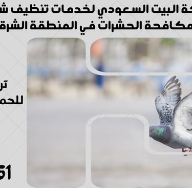 "نحن في شركة البيت السعودي نقدم خدمات تنظيف شاملة ومتكاملة تشمل تنظيف الشقق، المنازل، الفلل، القصور، والمكاتب، بالإضافة إلى مكافحة الحشرات بأنواعها وعزل الخزانات والأسطح. نغطي جميع مدن المنطقة الشرقية مثل الدمام، الخبر، القطيف، الجبيل، رأس تنورة، النعيرية، بقيق، الأحساء (الهفوف والمبرز)، والظهران. تواصل معنا الآن لخدمة احترافية بأعلى معايير الجودة."